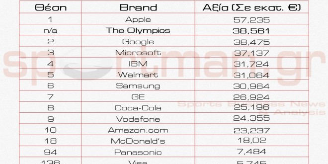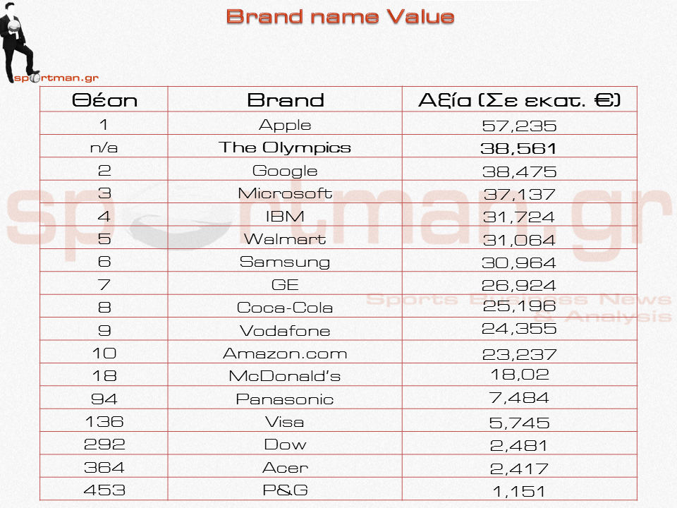 Μια πρόσφατη έρευνα από την Brand-Finance κατέδειξε ότι οι Ολυμπιακοί Αγώνες σαν brand name , αξίζουν 38,561 εκατ. €