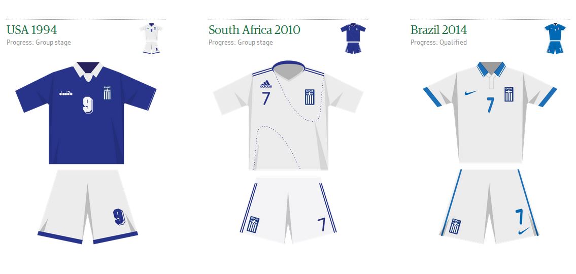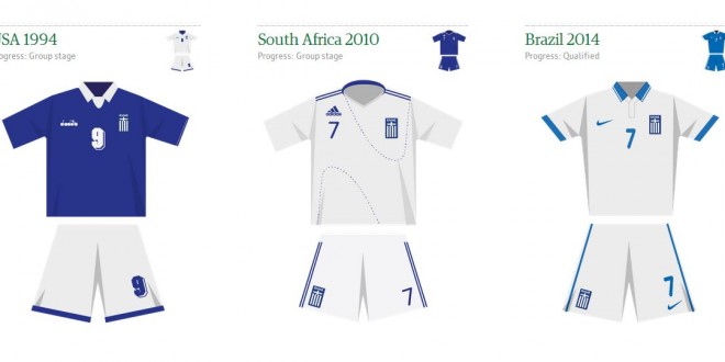 Στο εξαρετικό interactive infographic του Guardian παρουσιάζονται όλες οι εμφανίσεις των Εθνικών ομάδων που συμμετέχουν στο φετινό Παγκόσμιο Κύπελλο της Βραζιλίας. Όπως βλέπουμε την Εθνική μας ομάδα έντυνε στο Παγκόσμιο Κύπελλο της Αμερικής το 1994 η Diadora, σε αυτό της Νοτίου Αφρικής το 2010 η Adidas ενώ στο φετινό της Βραζιλίας, χορηγός ιματισμού είναι η NIKE.