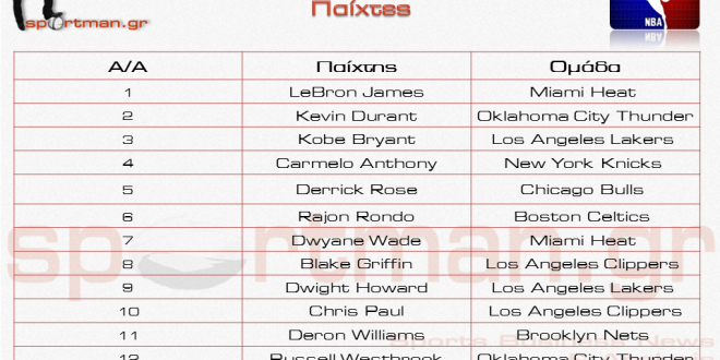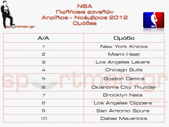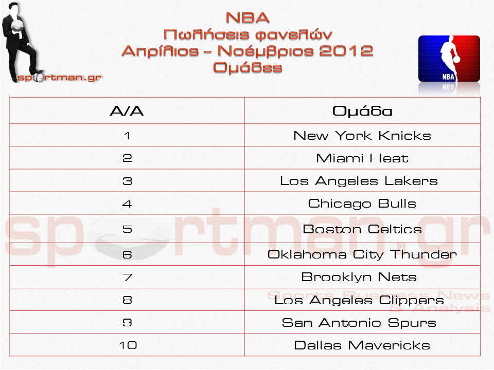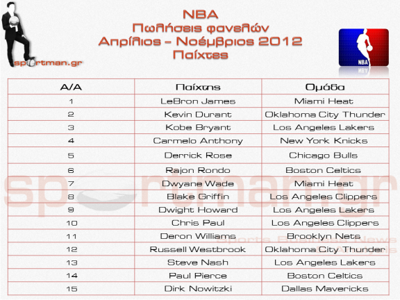 Πρέπει να σημειώσουμε ότι ο Derrick Rose ήταν ο πρώτος στην λίστα τον περασμένο Απρίλη πριν τον τραυματισμό του. Ενδιαφέρων θα είναι να δούμε την μεταβολή των πωλήσεων φανελών του Rose όταν επιστρέψει στην ενεργό δράση στις αρχές του χρόνου.