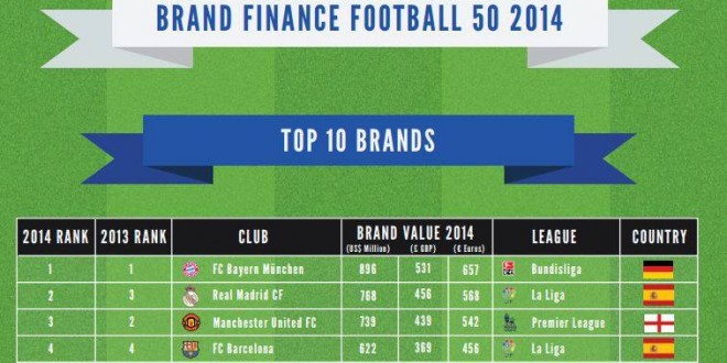 Η Bayer Munich ανεβαίνει κάθε χρονιά ενώ η Manchester United, η οποία ήταν στην κορυφή το 2011 και το 2012, βλέπει το brand της να μειώνεται τα δύο τελευταία χρόνια.