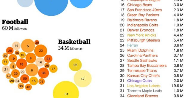 Σύμφωνα με τα ευρήματα της έρευνας, το ποδόσφαιρο είναι το ποιο δημοφιλές άθλημα στον κόσμο καθώς συγκεντρώνει 194 εκατομμύρια followers σε Facebook και Twitter μαζί. Ακολουθεί το Αμερικάνικο ποδόσφαιρο με 60 εκατομμύρια followers.