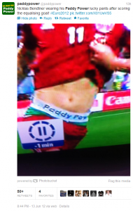 Δευτερόλεπτα μετά την επίτευξη του δεύτερου γκολ ο Bendtner σήκωσε την φανέλα και κατέβασε το σορτς του, τόσο ώστε να φανεί η διαφήμιση που είχε στο εσώρουχό του! Σε αυτό υπήρχε το όνομα της στοιχηματικής εταιρίας Paddy Power η οποία μέσω του επίσημου λογαριασμού της στο Twitter φρόντισε να ενημερώσει το κοινό της ότι ο Bendtner σκόραρε φορώντας το τυχερό του εσώρουχο. Η Paddy Power δεν είναι επίσημος χορηγός του Euro 2012 και η επιλογή της να σπονσοράρει τον Bendtner αποτελεί ambush marketing.