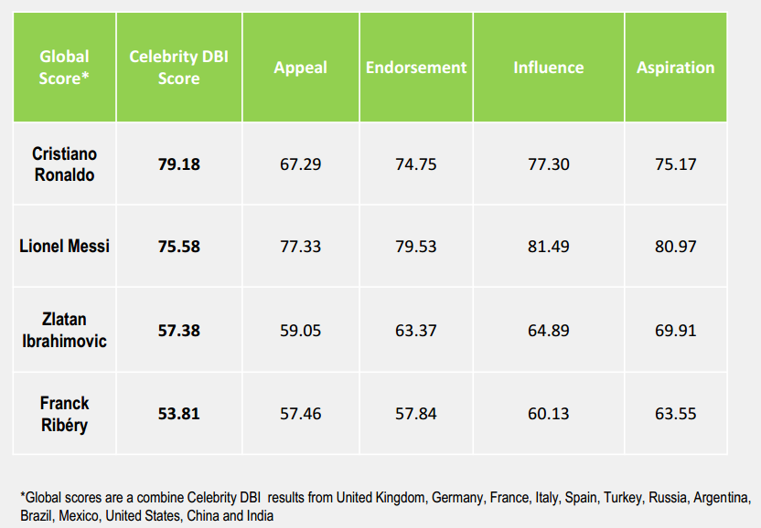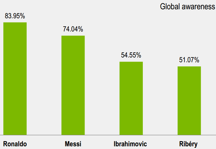 Όσον αφορά την παγκόσμια αναγνωρισιμότητα, το 74% των ανθρώπων γνωρίζουν τον Lionel Messi, 54,5% τον Zlatan Ibrahimovic και 51% τον Franck Ribéry. Ribéry και Ibrahimovic συγκεντρώνουν υψηλούς δείκτες στην κατηγορία Aspiration (ο δείκτης μετράει την φιλοδοξία των ανθρώπων να μοιάσουν στα ινδάλματά τους).