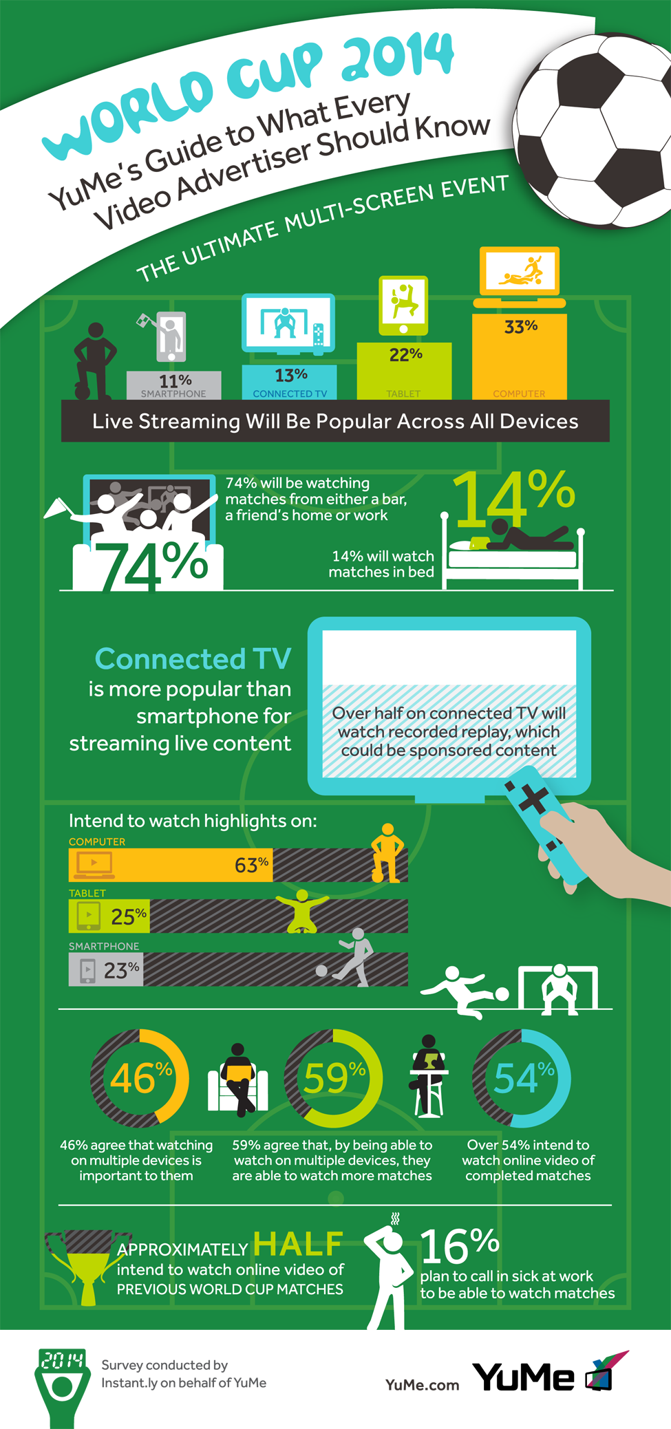 Το μουντιάλ της Βραζιλίας είναι σε εξέλιξη και είναι πολλά τα infographic που κυκλοφορούν σχετικά με την διοργάνωση. Το infographic της Yume παρουσιάζει τον τρόπο με τον οποίο οι φίλοι του ποδοσφαίρου αναμένεται να παρακολουθήσουν τα παιχνίδια του FIFA World Cup.