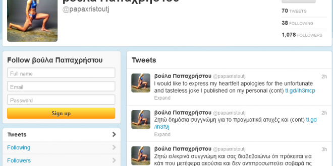 Το συγκεκριμένο tweet ήταν η αιτία για τον αποκλεισμό της κα. Παπαχρήστου από τους Ολυμπιακούς αγώνες του Λονδίνου.