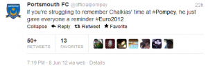 Η Portsmouth FC έβγαλε «χολή» μέσω του επίσημου λογαριασμού της στο twitter για το γκολ που δέχτηκε ο Κώστας Χαλκιάς από τον Robert Lewandowski στο εναρκτήριο μάτς του EURO 2012.
