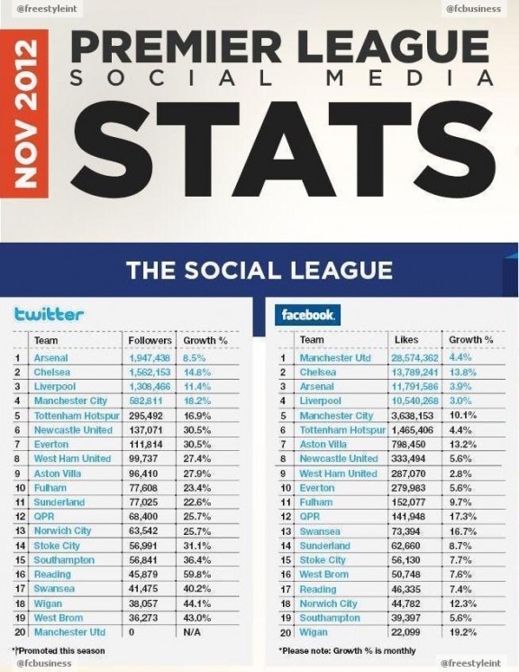 Το FC Business Magazine ανέλυσε τους social media λογαριασμούς των ομάδων της Premier League και δημιούργησε τον παρακάτω συγκεντρωτικό πίνακα. Πρώτη στο Twitter είναι η Arsenal FC ενώ στο Facebook κυριαρχεί η Manchester United. Όπως παρατηρούμε, όλες οι ομάδες της κατηγορίας έχουν παρουσία στα δύο σημαντικότερα κοινωνικά δίκτυα σε αντίθεση με ότι συμβαίνει στην Ελλάδα, όπου μόνο οι 10/16 ομάδες έχουν παρουσία στο Facebook και οι 8/16 στο Twitter!