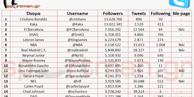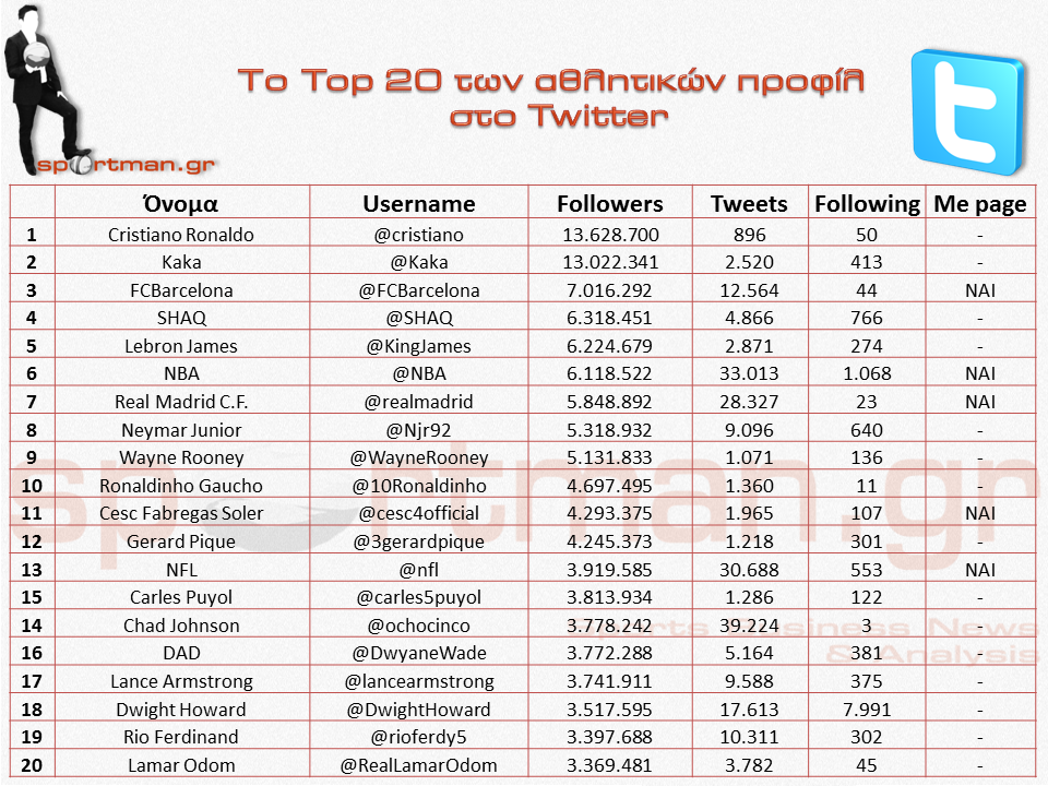 Μόλις δύο ομάδες βρίσκονται στην πρώτη εικοσάδα (Real Madrid C.F. & Barcelona FC) καθώς και δύο οργανισμοί (NBA & NFL). Οι υπόλοιποι 16 είναι αθλητές γεγονός που καταδεικνύει τους ισχυρισμούς μας στην αρχή του άρθρου. Πρέπει να σημειώσουμε ότι ο Cristiano Ronaldo έχει τους υπερδιπλάσιους followers απ’ ότι έχει η ομάδα στην οποία αγωνίζεται!!