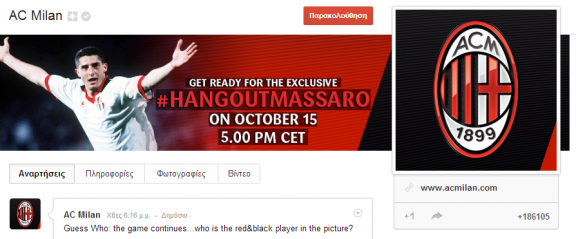 Αυτή την φορά η AC Milan πάει ένα βήμα παρακάτω διοργανώνοντας το πρώτο της Hangout με τον πρώην παίχτη της και νυν υπεύθυνο PR, κ. Daniele Massaro. Οι Ροσονέρι ακολουθούν το παράδειγμα των Manchester City και Chelsea που διοργάνωσαν Hangouts με τον Patrick Vieira και τον Petr Cech αντίστοιχα. Το Hangout έχει προγραμματιστεί για τις 15 Οκτωβρίου 2012, στις 6 μ.μ. (ώρα Ελλάδος).