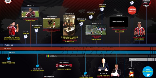 Σε προηγούμενο άρθρο μας σχολιάσαμε την καμπάνια της AC Milan για τους 10 εκατ. φίλους της στο Facebook. Είναι εμφανές ότι η Ιταλική ομάδα έχει επενδύσει αρκετά στα social media. Τον τελευταίο χρόνο έχει διπλασιάσει τους “φίλους” της στο Facebook, έχει 5πλασιάσει τους followers της στο Twitter και έχει παρουσία στο Google+ και Tencent.