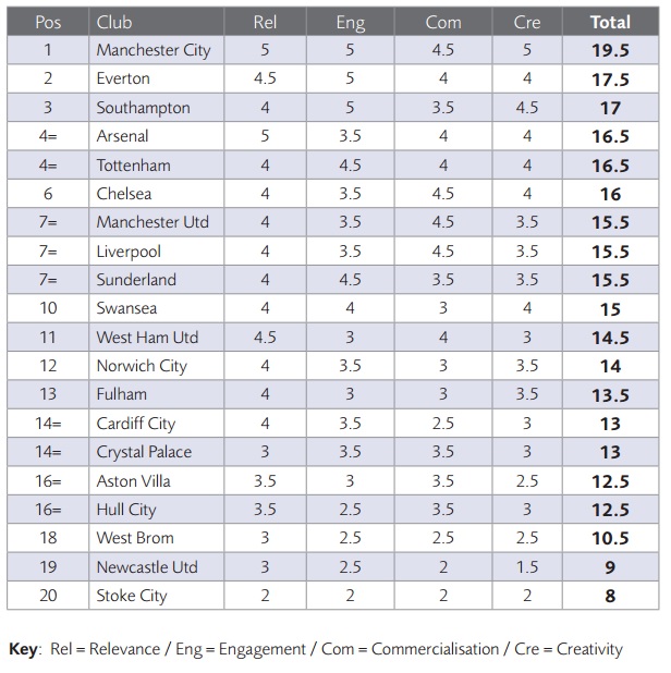 Η εταιρία βαθμολόγησε τις ομάδες σε τέσσερις ξεχωριστές κατηγορίες (relevance, engagement, commercialisation, creativity) σε όλα τα βασικά social media μέσα και έτσι προέκυψε ο παρακάτω πίνακας. Η έρευνα διήρκεσε από το τέλος Ιανουαρίου μέχρι τις αρχές Φεβρουαρίου.