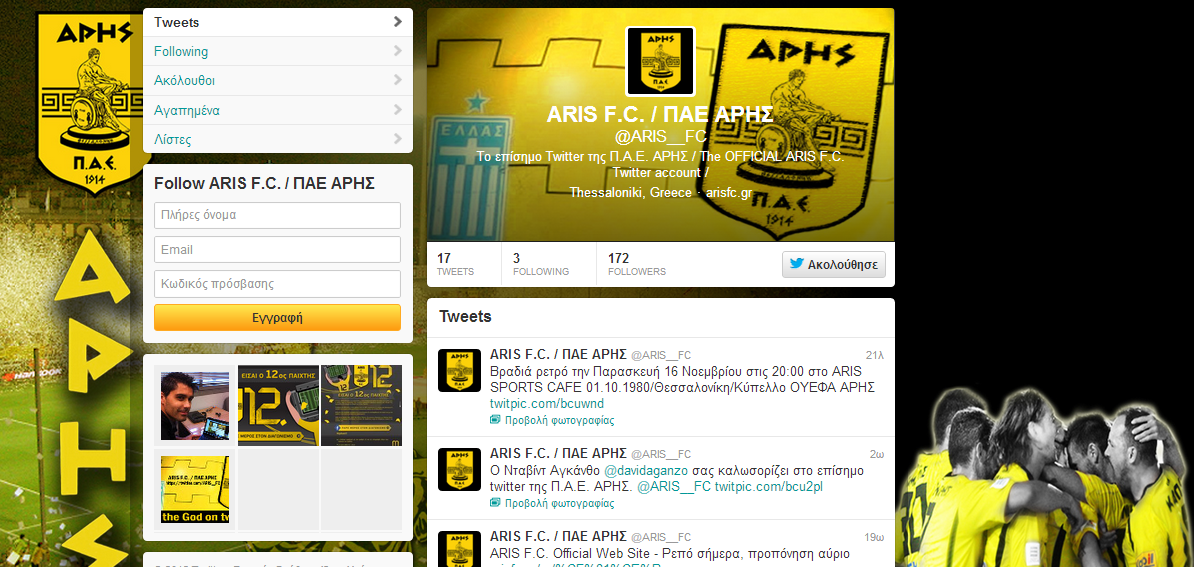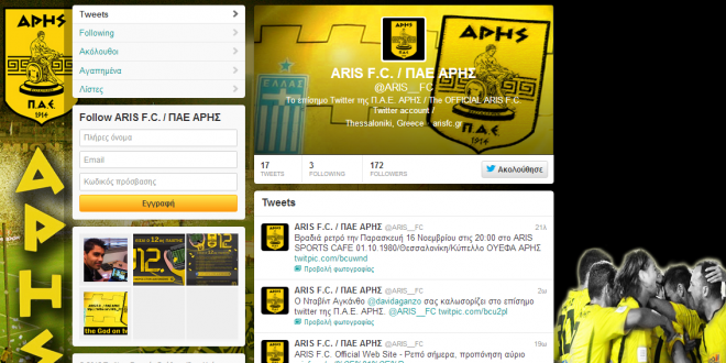 Η ΠΑΕ Αρης ανακοίνωσε την δημιουργία του νέου λογαριασμού της στο twitter. Η ομάδα της Θεσσαλονίκης γίνεται η 8η ομάδα της Super League με επίσημο λογαριασμό στο Twitter (οι υπόλοιπες είναι οι Α.Ε.Κ., Αστέρας Τρίπολης, Ατρόμητος, Ολυμπιακός, Πλατανιάς Χανίων, Π.Α.Ο.Κ. και ο Παναθηναϊκός).