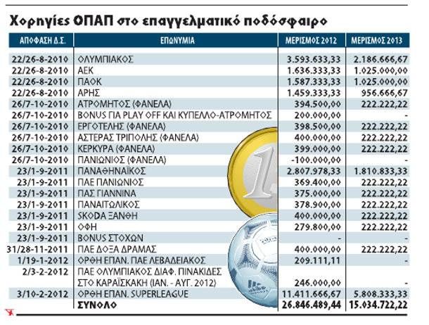 Η Ελευθεροτυπία δημοσίευσε δύο αναλυτικές λίστες με τις χορηγίες του ΟΠΑΠ για το έτος 2012/2013. Όπως γίνεται αντιληπτό από την ανάγνωση των λιστών, το επαγγελματικό ποδόσφαιρο, αλλά κι ο επί σειρά ετών πρωταθλητής Ελλάδας Ολυμπιακός, έχουν εισπράξει τη μερίδα του λέοντος από την πίτα των χορηγιών του ΟΠΑΠ.