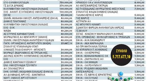 Το καθαρό ποσόν που κατευθύνθηκε σε αθλητικές ομοσπονδίες και σωματεία είναι 2.217.677,10 ευρώ.