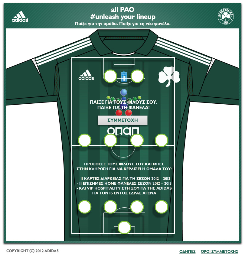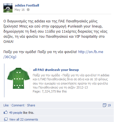 Η ΠΑΕ Παναθηναϊκός σε συνεργασία με την Adidas χρησιμοποίησαν τα social media δημιουργώντας μια εφαρμογή στο Facebook (all PAO) στην οποία