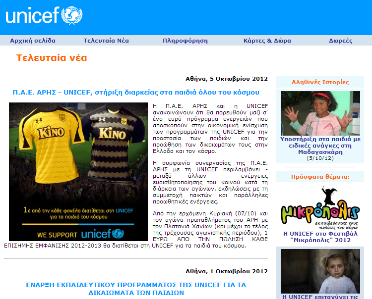 Ενημερώνουμε το φίλαθλο κοινό πως από την ερχόμενη Κυριακή (07/10) και τον αγώνα πρωταθλήματος με τον Πλατανιά Χανίων (και μέχρι το τέλος της τρέχουσας αγωνιστικής περιόδου), 1 ΕΥΡΩ ΑΠΟ ΤΗΝ ΠΩΛΗΣΗ ΚΑΘΕ ΕΠΙΣΗΜΗΣ ΕΜΦΑΝΙΣΗΣ 2012-2013 θα διατίθεται στη UNICEF για τα παιδιά του κόσμου.