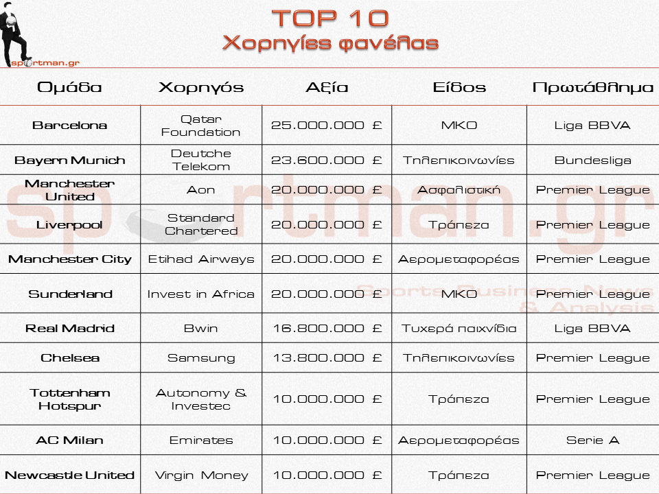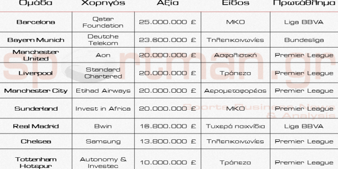 Η Barcelona βρίσκεται στην πρώτη θέση αφού κερδίζει περίπου 25 εκατ. λίρες από την συμφωνία της με την Qatar Foundation. Οι χορηγίες των Liverpool με την Standard Chartered και της Manchester City με την Etihad κοστίζουν γύρω στα 20 εκατ. λίρες, ενώ και η Sunderland ανέβηκε αισθητά στην λίστα μετά την συμφωνία της με την Invest in Africa.